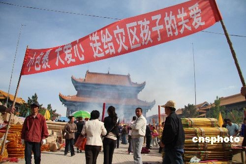 5月12日,黑龙江大庆静觉寺打出“小包裹、大爱心,送给灾区孩子关爱”的横幅,香客们纷纷捐款购买学生书包,统一邮寄给汶川地震灾区的孩子们,以此纪念“5.12”汶川地震一周年。中新社发 王茂桓 摄