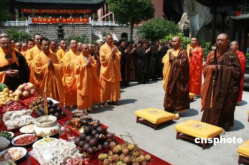 5月12日,浙江省温岭市佛教协会在新河镇长屿硐天八仙岩景区万佛寺内举行纪念汶川大地震一周年祈祷法会,纪念汶川大地震中遇难同胞,祝愿世界和平,祖国昌盛,风调雨顺,人民安乐。中新社发 黄晓慧 摄