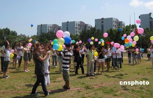 5月12日14时28分,就读于广西北海市艺术设计职业学院的来自四川、河南等地学子,在学校操场上对“5·12汶川大地震”死难者默哀三分钟后,放飞手中的512个气球,祝福四川震区人民的苦难与悲伤随风逝去。中新社发 冯抒敏 摄