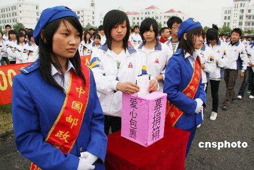5月12日,江苏海安县团委、少工委与县邮政局联合在双楼职业高级中学启动“5·12灾区学生六一关爱行动”捐赠仪式,给灾区学生送上一份关爱。中新社发 江苏-徐瑞平 摄