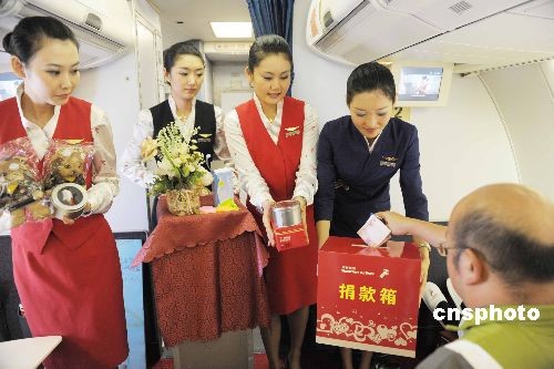 五月十二日,深航数十个航班掀起5·12地震周年心祭活动,在万米高空点燃“爱的希望”,旅客在机舱内纷纷捐款帮助灾区儿童。中新社发 陈文 摄
