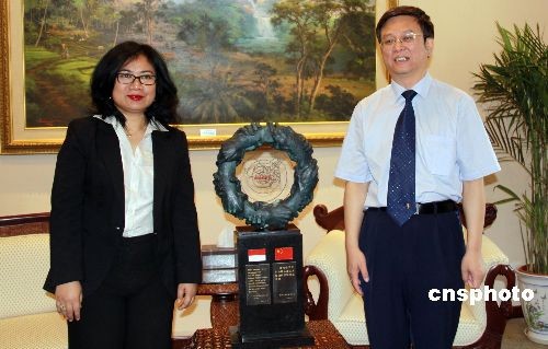 近日,“5·12”汶川特大地震一周年之际,中国人权发展基金会将其专门制作的青铜材质“汶川地震国际救援致谢碑”,赠送曾来华参加汶川地震救援的11支外国救援队以表达谢意。图为中国人权发展基金会副理事长林伯承(右),将致谢碑送到印度尼西亚驻华使馆。中新社发 任靖 摄