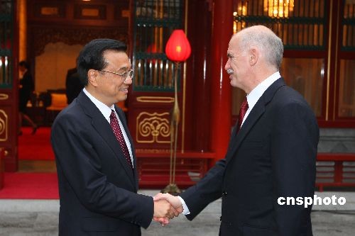 5月14日,中共中央政治局常委、国务院副总理李克强,在北京会见来华出席可持续发展问题研讨会的社会党国际主席帕潘德里欧等外方代表。中新社发 盛佳鹏 摄