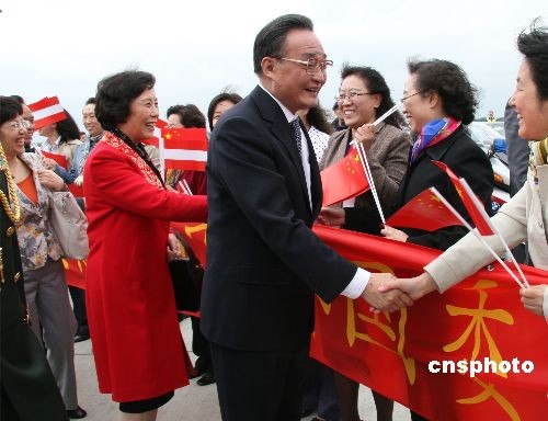 中国全国人大常委会委员长吴邦国和夫人章瑞珍,当地时间五月十五日上午乘专机抵达维也纳,开始对奥地利进行正式友好访问,受到中国驻奥使馆工作人员、华人华侨和留学生的热情迎接。中新社发 齐彬 摄