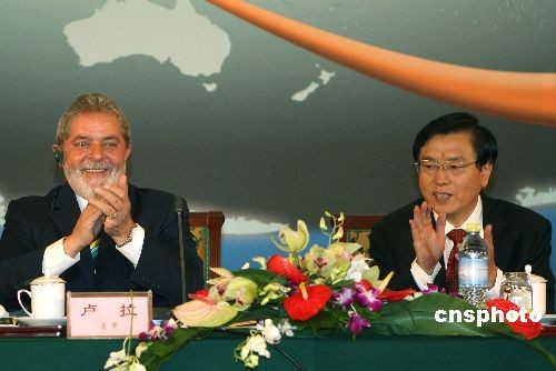 5月19日中午,中国国务院副总理张德江与巴西联邦共和国总统路易斯·伊纳西奥·卢拉·达席尔瓦共同出席在北京钓鱼台国宾馆举行的“中巴商务论坛”。中新社发 任晨鸣 摄