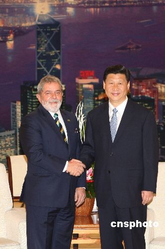 5月19日下午,中国国家副主席习近平在北京人民大会堂香港厅会见访华的巴西联邦共和国总统路易斯·伊纳西奥·卢拉·达席尔瓦。中新社发 任晨鸣 摄