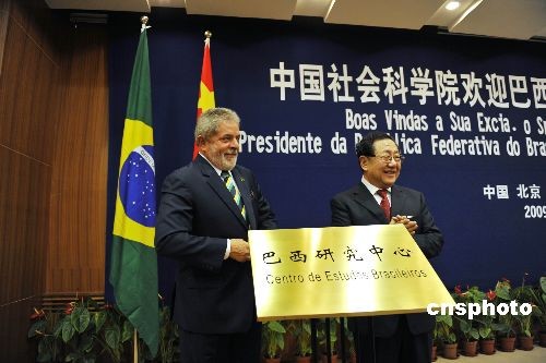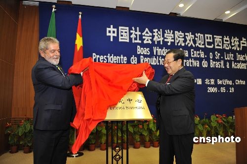 5月19日,正在对中国进行国事访问的巴西总统卢拉在中国社会科学院举行演讲,表达进一步巩固巴中战略伙伴关系的信心。图为巴西总统卢拉与全国政协副主席、中国社会科学院院长陈奎元共同为巴西研究中心揭牌。中新社发 李学仕 摄