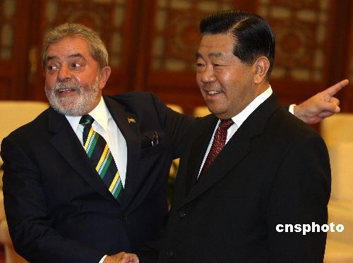 5月19日下午,中国全国政协主席贾庆林在北京人民大会堂会见巴西联邦共和国总统路易斯·伊纳西奥·卢拉·达席尔瓦。中新社发 任晨鸣 摄