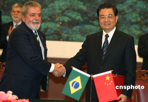 5月19日晚,中国国家主席胡锦涛与巴西联邦共和国总统路易斯·伊纳西奥·卢拉·达席尔瓦在北京人民大会堂会谈后签署两国联合公报,并共同出席多项经济技术合作签字仪式。中新社发 任晨鸣 摄