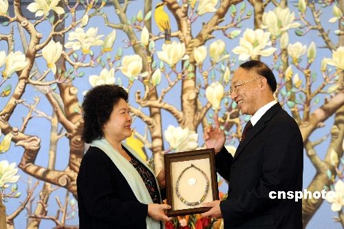 5月22日,中国奥委会主席刘鹏在北京饭店会见高雄市长陈菊时,陈菊向刘鹏赠送台湾原住民首饰礼品。中新社发 廖攀 摄