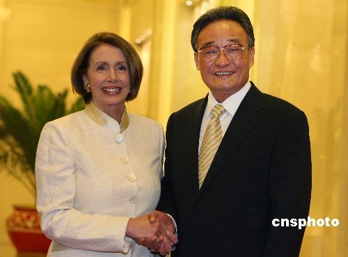 5月27日晚,中国全国人大常委会吴邦国委员长在北京人民大会堂欢迎美国国会众议院议长南希·佩洛西访华。南希·佩洛西议长应吴邦国的邀请,从5月24日至5月30日到中国访问。中新社发 任晨鸣 摄