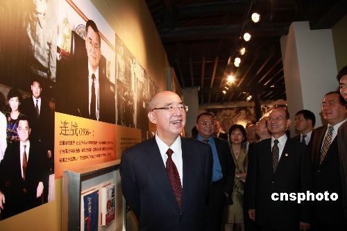 五月三十日,中国国民党主席吴伯雄率中国国民党大陆访问团参观了“连横纪念馆—台湾文化展”。吴伯雄在参观完纪念馆后表示,看了这个纪念馆之后,我们知道两岸文化一脉相承。两岸关系最大的源动力在于血脉和文化。图为中国国民党主席吴伯雄应记者要求与中国国民党名誉主席连战画像合影.中新社发 柴燕菲 摄