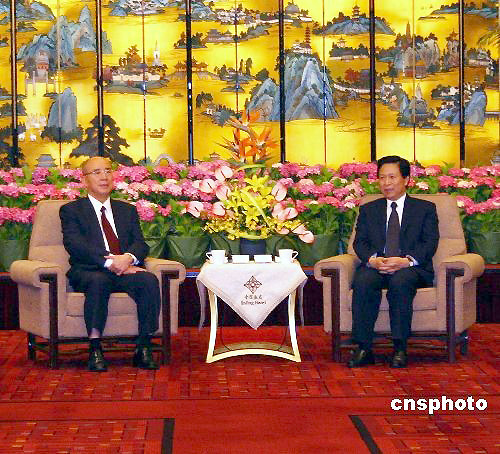 5月31日,中国国民党主席吴伯雄率领的中国国民党大陆访问团一行抵达南京,这是中国国民党访问团“八日大陆行”的最后一站。江苏省委书记梁保华当日在南京金陵饭店会见吴伯雄一行。中新社发 朱晓颖 摄