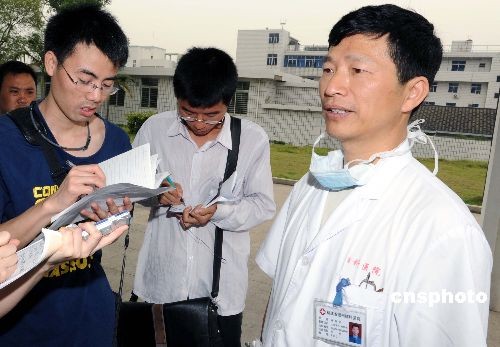 6月1日,福州市肺科医院副院长林钟轩(右)在接受记者采访时表示:福建省第四例甲型H1N1流感患者经过治疗目前病情有所好转。该患者,男,22岁,美国籍,在美国一企业工作。5月26日从纽约乘机经温哥华至香港,在香港转乘KA660航班,北京时间28日上午抵达福州长乐国际机场。30日上午因发热、咳嗽就诊连江县琯头卫生院,测体温38.3℃。31日凌晨转至福州肺科医院隔离治疗,入院测体温39.3℃,伴咳嗽、头痛、咽痛等流感样症状。30日晚上福州市疾病预防控制中心对患者鼻咽拭子标本进行了检测,结果为甲型H1N1流感病毒核酸阳性。省卫生厅专家组根据患者的临床表现、流行病学史和实验室检测结果,按照卫生部制定的诊疗方案,判定该病例为甲型H1N1流感确诊病例。相关情况已经报告卫生部。中新社发 刘可耕 摄