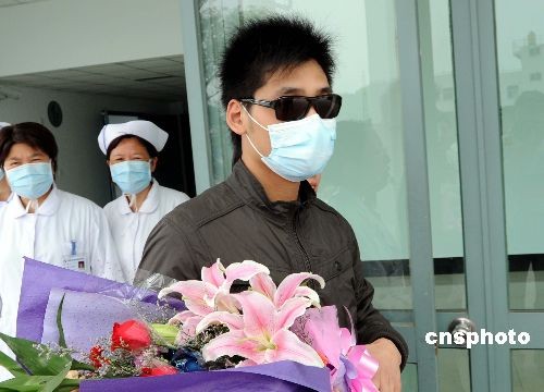 6月1日,福建省第二例甲型H1N1流感患者经过福建省、福州市专家的精心治疗从福州肺科医院隔离病房康复出院。福建省卫生厅、福州市卫生局领导及该院医务人员前来欢送患者。中新社发 刘可耕 摄
