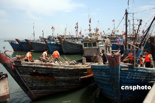 2009年6月1日,黄渤海进入伏季休渔期。辽宁锦州渔船陆续归港靠岸,同时锦州边防支队港船民警在码头为渔民报港登记,督促渔民按时回港。中新社发 李张建 摄