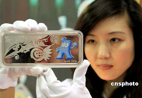 6月2日,上海世博银公开发行。这是继上海世博金之后,面向全球公开、限量发行的世博会题材纪念银条,包括50克、100克、1000克以及5条40克组合系列,图案设计完美诠释世博会“城市让生活更美好”的理念。 中新社发 潘索菲 摄