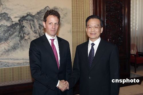 6月2日,中国国务院总理温家宝在北京中南海紫光阁会见美国总统奥巴马特别代表、财政部长盖特纳。中新社发 盛佳鹏 摄