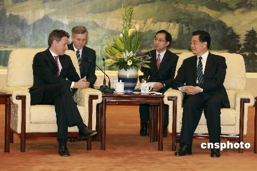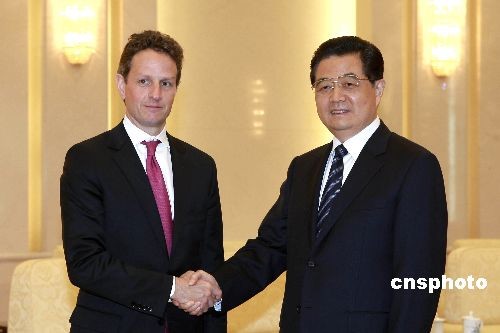 6月2日,中国国家主席胡锦涛在北京人民大会堂会见美国总统奥巴马特别代表、财政部长盖特纳。中新社发 盛佳鹏 摄