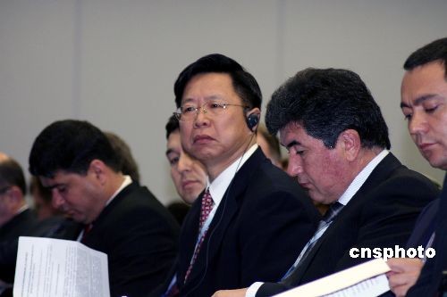 六月五日,上海合作组织经济会议在第十三届圣彼得堡国际经济论坛框架下举行,主要讨论区域合作与经济稳定增长,上合成员国投资合作发展道路,金融保险机制等议题。中国贸促会副会长、上合组织实业家委员会中方主席于平(中)率领中国实业家代表团出席会议并发言。中新社发 田冰 摄