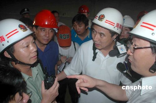 6月6日中午,海南省省长罗保铭来到三亚隧道坍塌事故现场指导营救工作。6月4日23时许,正在施工的三亚绕城高速公路迎宾隧道发生坍塌事故,8名施工人员被困。目前,营救工作在继续,截止当日中午十二时,尚无被困人员被救出。罗保铭表示,将尽全力营救被困人员。中新社发 尹海明 摄