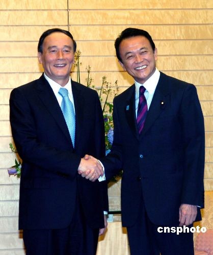 6月8日,日本首相麻生太郎在位于东京的首相官邸会见了中国国务院副总理王岐山,并表示对第二次中日高层经济对话取得的显著成果表示满意。中新社发 朱沿华 摄