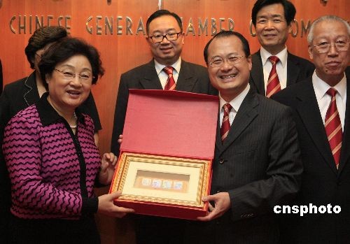 六月八日下午,中国国务院侨办主任李海峰一行拜访香港中华总商会。图为该会蔡冠深会长向国务院侨办主任李海峰一行赠送礼品。中新社发 张勤 摄