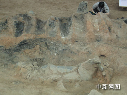 六月十三日十三时,西安考古工作者开始对被誉为“世界第八奇迹”的秦始皇兵马俑一号坑进行发掘,这是其沉寂二十多年后迎来的第三次考古发掘。图为发掘现场的陶马残片。中新社记者 冽玮摄