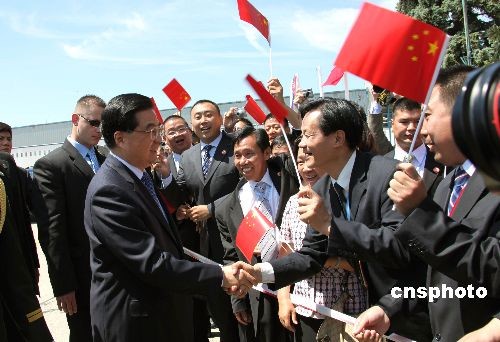 当地时间六月十八日中午,中国国家主席胡锦涛乘专机抵达斯洛伐克首都布拉迪斯拉发,开始对斯洛伐克进行国事访问。图为胡锦涛主席与欢迎者热情握手。中新社发 齐彬 摄