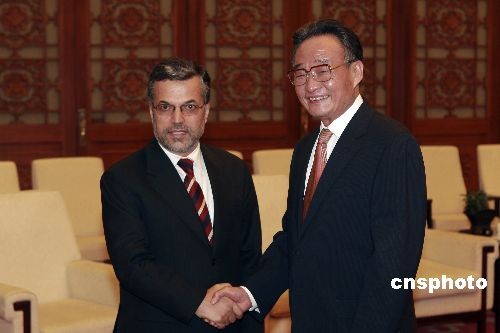 6月22日,中国全国人大常委会委员长吴邦国在北京人民大会堂会见来访的阿富汗议会人民院议长穆罕默德·尤努斯·加努尼。中新社发 盛佳鹏 摄