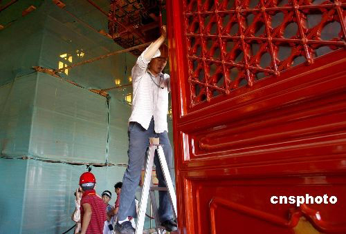 6月29日,工作人员在北京天安门城楼修缮工程现场施工,城楼梁柱等已粉刷一新。据悉,此次天安门城楼修缮工程主要以梁柱、屋顶等部位的重新粉刷和彩绘为主,将以崭新的面貌迎接新中国成立60周年。中新社发 郑雄增 摄