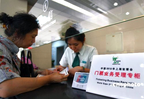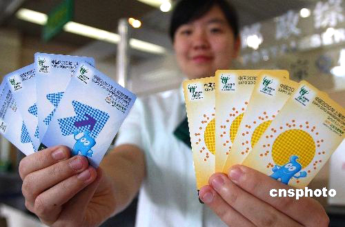 7月1日,中国2010年上海世界博览会的指定日普通票和平日普通票开始向境内外个人发售。民众可在中国邮政、中国移动、交通银行、中国电信4家指定销售代理商全国范围内的2796个销售网点购买门票。中新社发 富田 摄
