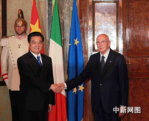 正在意大利进行国事访问的中国国家主席胡锦涛,当地时间六日上午与意大利总统纳波利塔诺在位于罗马的总统府内举行会谈。图为会谈前,两位领导人在会谈厅外握手。中新社记者 张朔摄