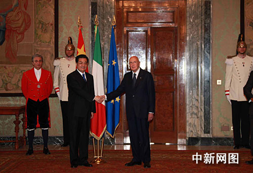 正在意大利进行国事访问的中国国家主席胡锦涛,当地时间六日上午与意大利总统纳波利塔诺在位于罗马的总统府内举行会谈。图为会谈前,两位领导人在会谈厅外握手。中新社记者 张朔摄