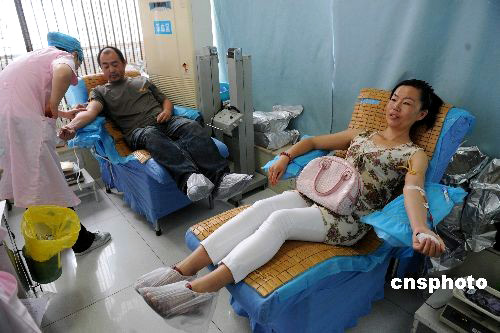 7月8日,乌鲁木齐市的众多市民在献血站内踊跃献血,救助在7·5事件中身受重伤的受害者。中新社发 廖攀 摄