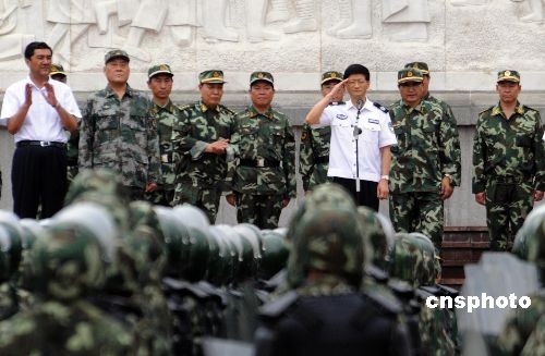 7月8日下午,国务委员、公安部部长孟建柱在乌鲁木齐市人民广场向武警战士敬礼。中新社发 廖攀 摄