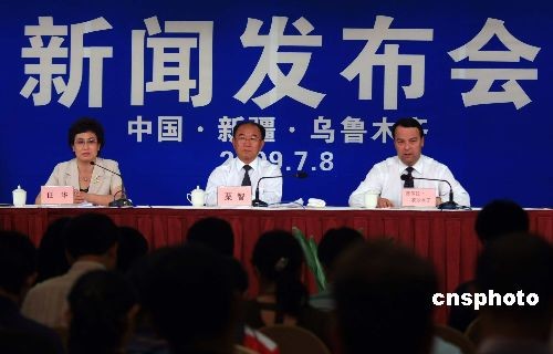 7月8日,乌鲁木齐市召开新闻发布会,中共乌鲁木齐市委书记栗智(中)称,“七·五”打砸抢烧严重暴力犯罪事件的犯罪嫌疑人绝大部分已被抓获归案,目前正在审理。中新社发 刘新 摄