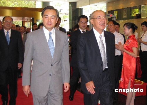 中国国民党主席吴伯雄率参加第五届两岸经贸文化论坛的中国国民党代表团,7月10日下午乘台北直飞的包机抵达湖南长沙黄花机场。中共中央台办主任王毅等到机场欢迎。第五届两岸经贸文化论坛将于7月11日至12日在长沙举行,论坛的主题是两岸文教交流。中国国民党、亲民党、新党、无党团结联盟、部分民进党人士,和众多台湾文化、教育、宗教届和经济界代表与会。中新社发 傅煜 摄