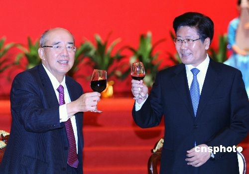 第五届两岸经贸文化论坛7月11日在长沙开幕,当晚,东道主湖南省委举行晚宴招待论坛嘉宾。图为中国国民党主席吴伯雄(左)与中共湖南省委书记张春贤共同举杯庆祝论坛开幕。中新社发 宋吉河 摄