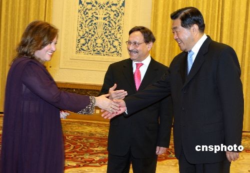 7月13日下午,中国全国政协主席贾庆林在北京人民大会堂会见巴基斯坦参议院主席奈克和夫人。中新社发 任晨鸣 摄