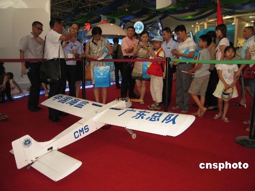 7月18日,一架小型船载无人驾驶飞机在珠海首届中国海洋博览会上亮相,该机型将于年内装备于中国海监广东总队。据悉,这种飞机可以实现自主飞行、目标定位和实时空中图像和数据传播,快速机动地发现海上违法违规目标。中新社发 索有为 摄