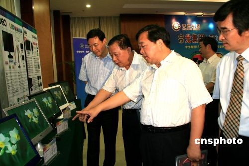 7月20日上午,扬州举行由某集团自主研发的LED显示终端系列产品发布会并现场进行展示,凸显LED终端显示应用产品在健康、节能、环保和超薄、时尚等方面超前的理念。扬州市委书记季建业、市长王燕文等出席。季建业(右二)表示,扬州要着力推动绿色新能源产业的技术向高端突破,产品向终端延伸,推出“五个一”计划,即1000万台LED显示器、1000万台LED电视机、1000万台一体化笔记本电脑、1亿盏LED灯、1亿本E-book。到2012年,新能源、新光源产业实现产值“双千亿”。中新社发 崔佳明 摄