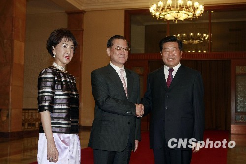7月27日,中共中央政治局常委、全国政协主席贾庆林在北京人民大会堂会见前来大陆参访的中国国民党荣誉主席连战一行。中新社发 盛佳鹏 摄