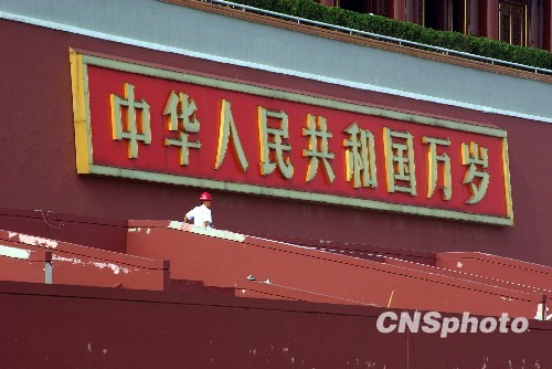 8月10日,为迎接国庆六十周年,工人们正在整修天安门观礼台。天安门观礼台是由我国第一代著名建筑大师张开济上世纪50年代初期设计的,与雄伟的天安门城楼巧妙组合,浑然一体。中新社发 九州 摄