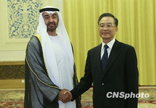 8月14日,中国国务院总理温家宝在北京人民大会堂会见阿联酋阿布扎比王储穆罕默德。中新社发 盛佳鹏 摄