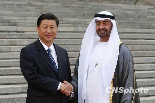 8月14日,中国国家副主席习近平在北京人民大会堂东门外广场举行仪式,欢迎阿联酋阿布扎比王储穆罕默德访华。中新社发 盛佳鹏 摄
