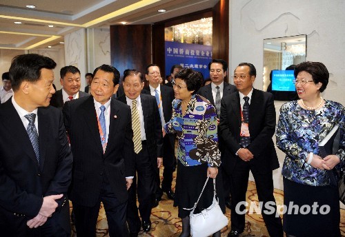 8月18日,中国侨商投资企业协会一届二次理事会在北京召开,国侨办主任李海峰(右四)、中国侨商会会长谢国民(左三)、副会长李文正(左四)、许荣茂(左一)等出席会议。中新社发 廖攀 摄