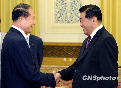 8月24日,全国政协主席贾庆林与韩国前国会副议长李相得握手。当日,贾庆林在北京人民大会堂会见了第九届“中韩知名人士论坛”韩方代表。中新社发 廖攀 摄
