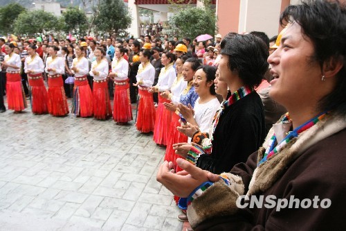 8月26日,湖南省援建的四川地震重灾区阿坝州理县中学竣工,工程总投资约7000万元,可满足理县中学2000师生的学习和生活。图为藏、羌族民众唱着“格桑花”庆祝当地唯一一所中学在震后恢复使用。中新社发 陈典路 摄