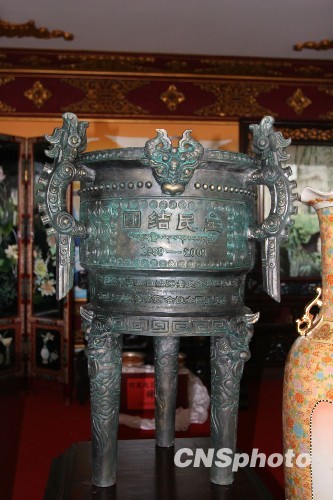 9月1日,纪念政协西藏自治区委员会成立五十周年大会在拉萨召开。中共中央政治局委员、全国政协副主席王刚率领的全国政协代表团向西藏政协赠送了一尊象征团结、民主、和谐吉祥的纪念宝鼎和一批物资。图为全国政协赠送的纪念宝鼎。中新社发 柳俊武 摄